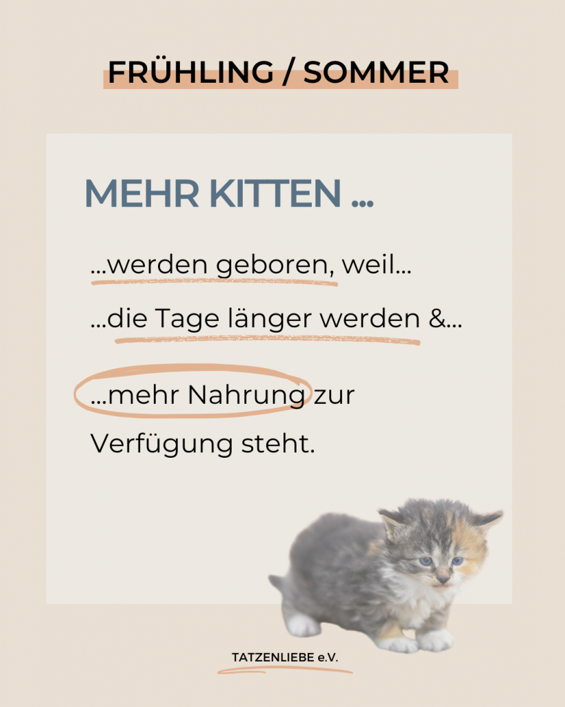 Die Katzendichte steigt im Frühling/Sommer: Die meisten Katzen bringen im Frühjahr bis Sommer Nachwuchs zur Welt, weil die Tage länger werden und mehr Nahrung verfügbar ist. Das führt dazu, dass viele Kätzinnen trächtig werden.