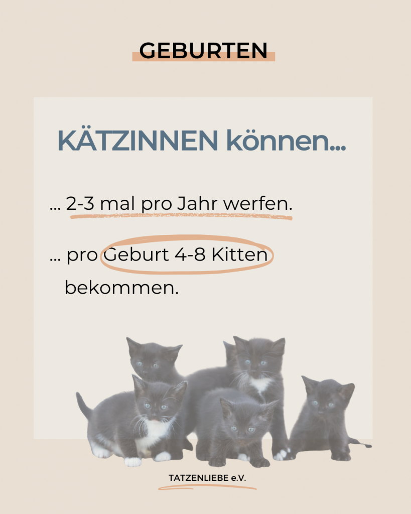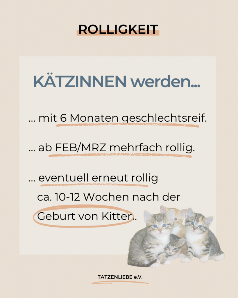 Katzen werden mit etwa einem halben Jahr geschlechtsreif. Ab Februar/März bis in den Spätsommer hinein werden sie mehrfach rollig. Nach der Geburt der Kitten tritt die erneute Rolligkeit der Mutterkatze normalerweise nach etwa 2 – 3 Wochen nach Beendigung der Säugeperiode ein, die 6 – 8 Wochen dauert. Kätzinnen können 2 bis 3 Mal pro Jahr werfen. Durchschnittlich kommen 4 – 6 Kitten pro Wurf zur Welt.
